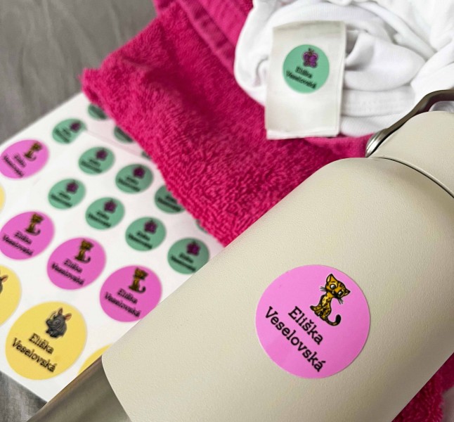 Samolepky dobře drží nejen na pevných površích, ale také na batohu, penálu, lahvi nebo textilních doplňcích. Ideální řešení pro označování věcí, personalizaci a každodenní použití.